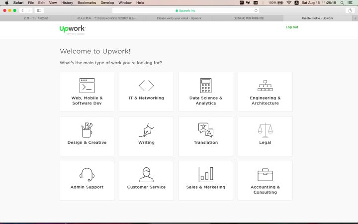11,点击Complete my profile按钮之后就来到了自己擅长的行业选择界面。Upwork共有12个大类的技能方向。选择一个自己擅长并想用它在上面挣钱的领域,程序员可以选择最上面一排的技能方向,比如我自己就要选 Translation了。