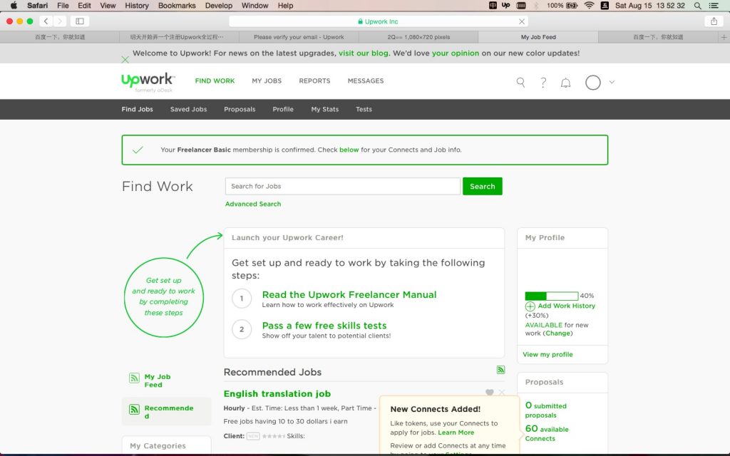 我的个人建议是,如果下定决心在Upwork做,一定要买会员,其实一个月也就60多块钱,也就是两杯咖啡的钱,你以一个比较合理的价格拿单,多挣的钱可以买好几年的会员了。对吧,效率也提高不是一点半点,另外带给自己的自信心和压力,也会促进自己努力接活,会员也可以随时取消。
